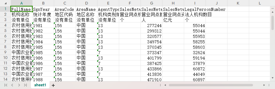 机构名称 统计年度 地区代码 地区名称 机构类别编码 营业网点机构个数 营业网点就业人数 营业网点资产总额 法人机构数目