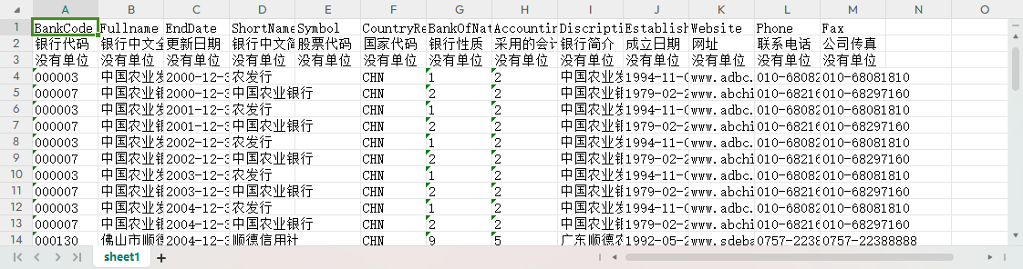 银行代码 银行中文全称 更新日期 银行中文简称 股票代码 国家代码 银行性质 采用的会计准则 银行简介 成立日期 网址 联系电话 公司传真