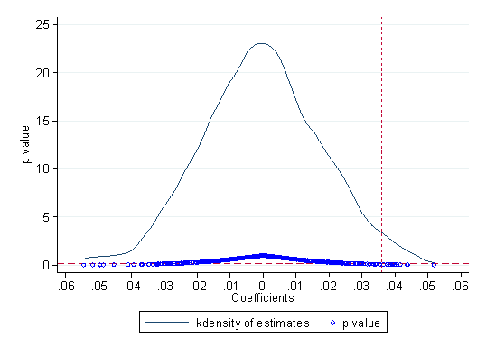友友们,DID的安慰剂检验中,为了检验遗漏变量,构造伪处理组,重复回归500次,得到这个图,请问这个图算通过了安慰剂检验了吗???????