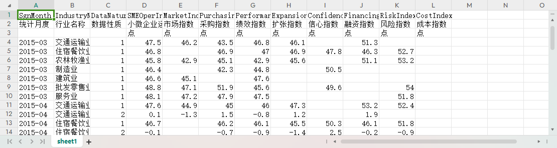 统计月度 行业名称 数据性质 小微企业运行指数 市场指数 采购指数 绩效指数 扩张指数 信心指数 融资指数 风险指数 成本指数