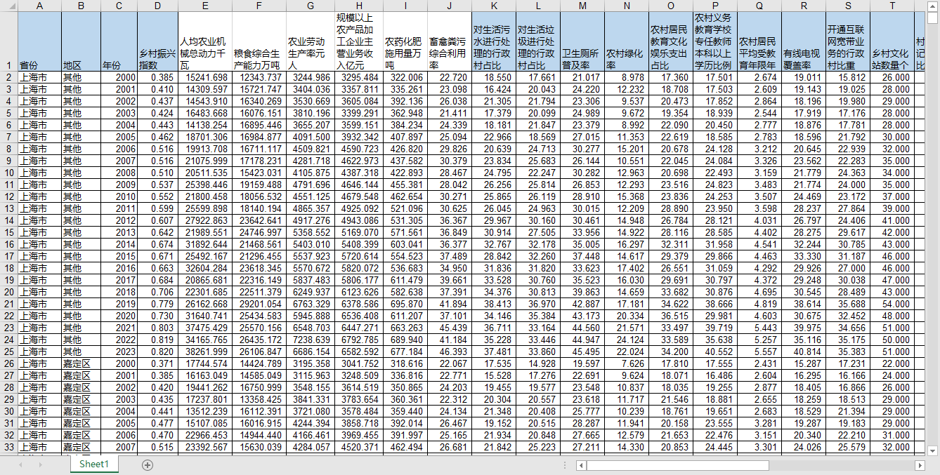 省份 地区 年份 乡村振兴指数 人均农业机械总动力千瓦 粮食综合生产能力万吨 农业劳动生产率元人 规模以上农产品加工企业主营业务收入亿元 农药化肥施用量万吨 畜禽粪污综合利用率 对生活污水进行处理的行政村占比 对生活垃圾进行处理的行政村占比 卫生厕所普及率 农村绿化率 农村居民教育文化娱乐支出占比 农村义务教育学校专任教师本科以上学历比例 农村居民平均受教育年限年 有线电视覆盖率 开通互联网宽带业务的行政村比重 乡村文化站数量个 村主任书记一肩挑比例 巳编制村庄规划的行政村占比 已开展村庄整治的行政村占比 农民人均纯收入元 农民人均收入增长率 城乡居民收入比 农村贫困发生率 农村居民恩格尔系数 每百户汽车拥有量辆 农村居民人均住房面积平方米 安全饮用水普及率 村庄道路硬化率 人均道路面积平方米 农村每千人拥有卫生技术人员数人