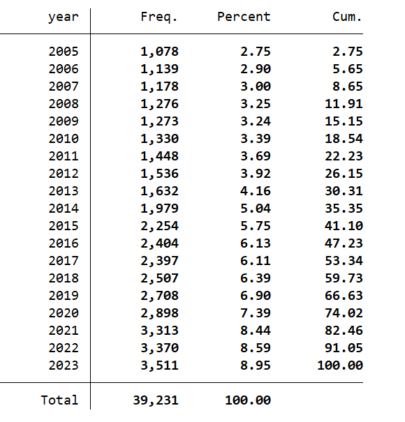 剔除金融行业,剔除当年IPO及上市以前的数据,剔除缺失值,原始数据区间2001-2023年,最终计算结果区间为2005-2023年。