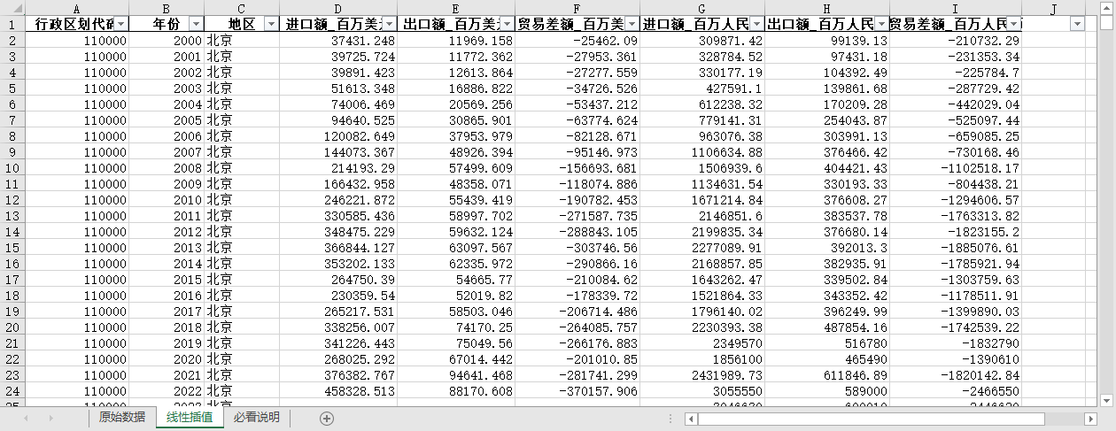 行政区划代码 年份 地区 进口额_百万美元 出口额_百万美元 贸易差额_百万美元 进口额_百万人民币 出口额_百万人民币 贸易差额_百万人民币