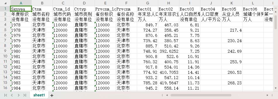 年度标识 城市名称 城市代码 城市类别 省份标识 省份名称 年末总人口 年末非农业人口 人口自然增长率(‰) 人口密度 从业人员 城镇个体劳动者 第一产业从业人员比重(%) 第二产业从业人员比重(%) 第三产业从业人员比重(%) 全部职工年均人数 全部职工工资总额 职工平均工资