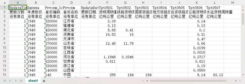 区域经济全国分省份货物周转量1949-2023货物周转量合计铁路货物周转量国家地方合资铁路货物周转量公路水运货物周转量