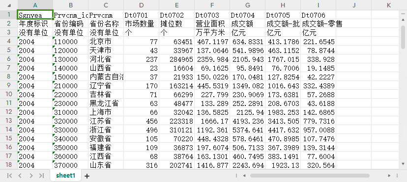年度标识 省份编码 省份名称 市场数量 摊位数 营业面积 成交额 成交额-批发 成交额-零售