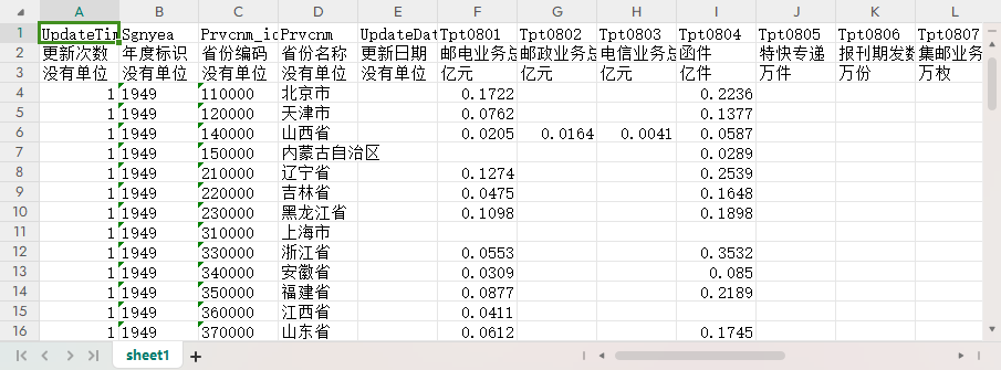 更新次数 年度标识 省份编码 省份名称 更新日期 邮电业务总量 邮政业务总量 电信业务总量 函件 特快专递 报刊期发数 集邮业务 长途电话 无线寻呼年末用户 移动电话年末用户 互联网上网人数 本地电话年末用户 城市电话用户 城市住宅电话用户 农村电话用户 农村住宅电话用户 公用电话