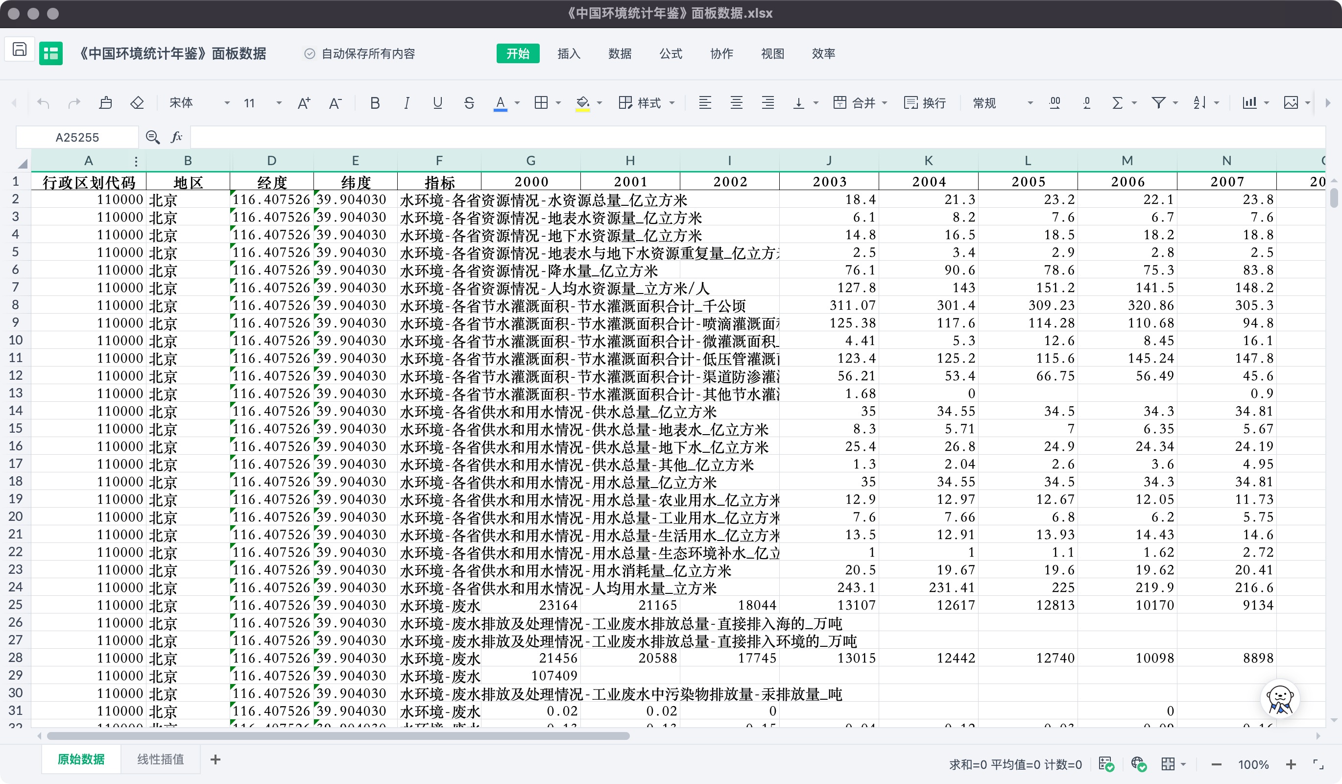 来源2001-2023年的环境年鉴(即2000-2022年),包含894个指标,包括自然状况、水环境、海洋环境、大气环境、固体废物、自然生态、自然灾害、环境投资、城市环境、农村环境等大类
