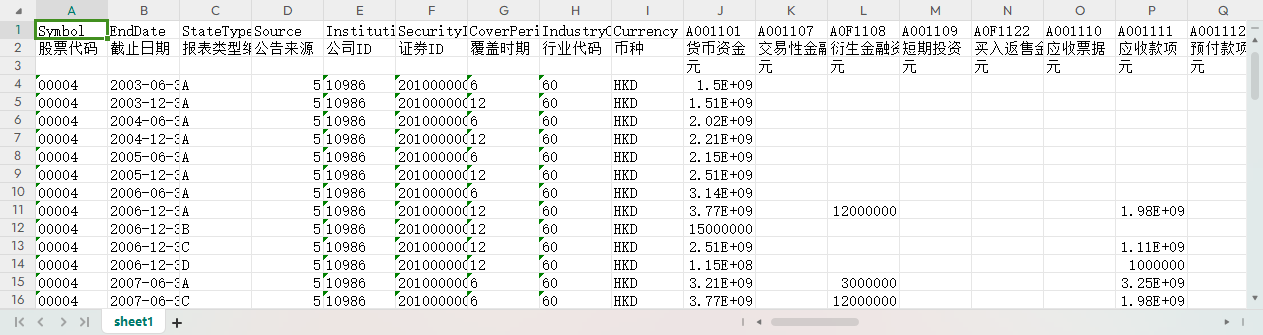 股票代码 截止日期 报表类型编码 公告来源 公司ID 证券ID 覆盖时期 行业代码 币种 货币资金 交易性金融资产 衍生金融资产 短期投资 买入返售金融资产 应收票据 应收款项 预付款项 其他应收款 应收利息 应收股利 存货 一年内到期的非流动资产 其他流动资产 流动资产合计 贷款及垫款 可供出售金融资产(待售证券) 持有至到期投资(持有证券) 长期股权投资 长期投资 长期应收款 投资性房地产净额 固定资产净额 在建工程净额 工程物资 固定资产清理 生产性生物资产净额 油气资产净额 无形资产净额 商誉净额 开发支出 长期待摊费用 递延所得税资产 其他非流动资产 非流动资产合计 资产总计 短期借款 交易性金融负债 衍生金融负债 卖出回购金融资产款 应付票据 应付账款 预收款项 应付职工薪酬 应交税费 应付利息 应付股利 应付手续费及佣金 其他应付款 一年内到期的非流动负债 其他流动负债 流动负债合计 长期借款 应付债券 长期应付款 预计负债 递延所得税负债 其他非流动负债 非流动负债合计 负债合计 实收资本(或股本) 资本溢价 专项储备 盈余公积 一般风险准备 保留溢利 外币报表折算差额 未确认的投资损失 交易风险准备 其他储备 归属于母公司所有者权益合计 少数股东权益 所有者权益合计 负债与所有者权益总计