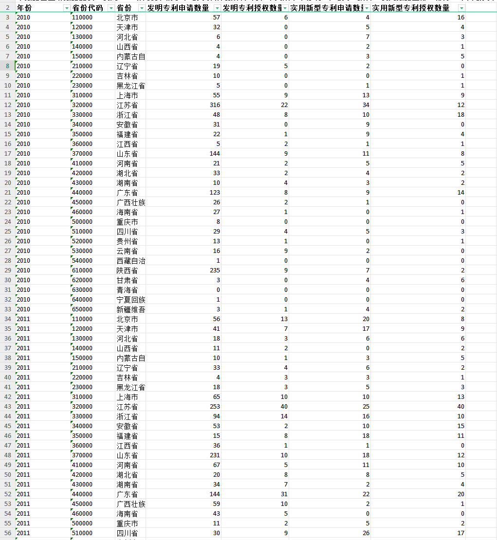 | 实用新型专利申请数量 | 实用新型专利申请数量,统计口径限制为"省份代码"、“专利申请日”为非空值 |