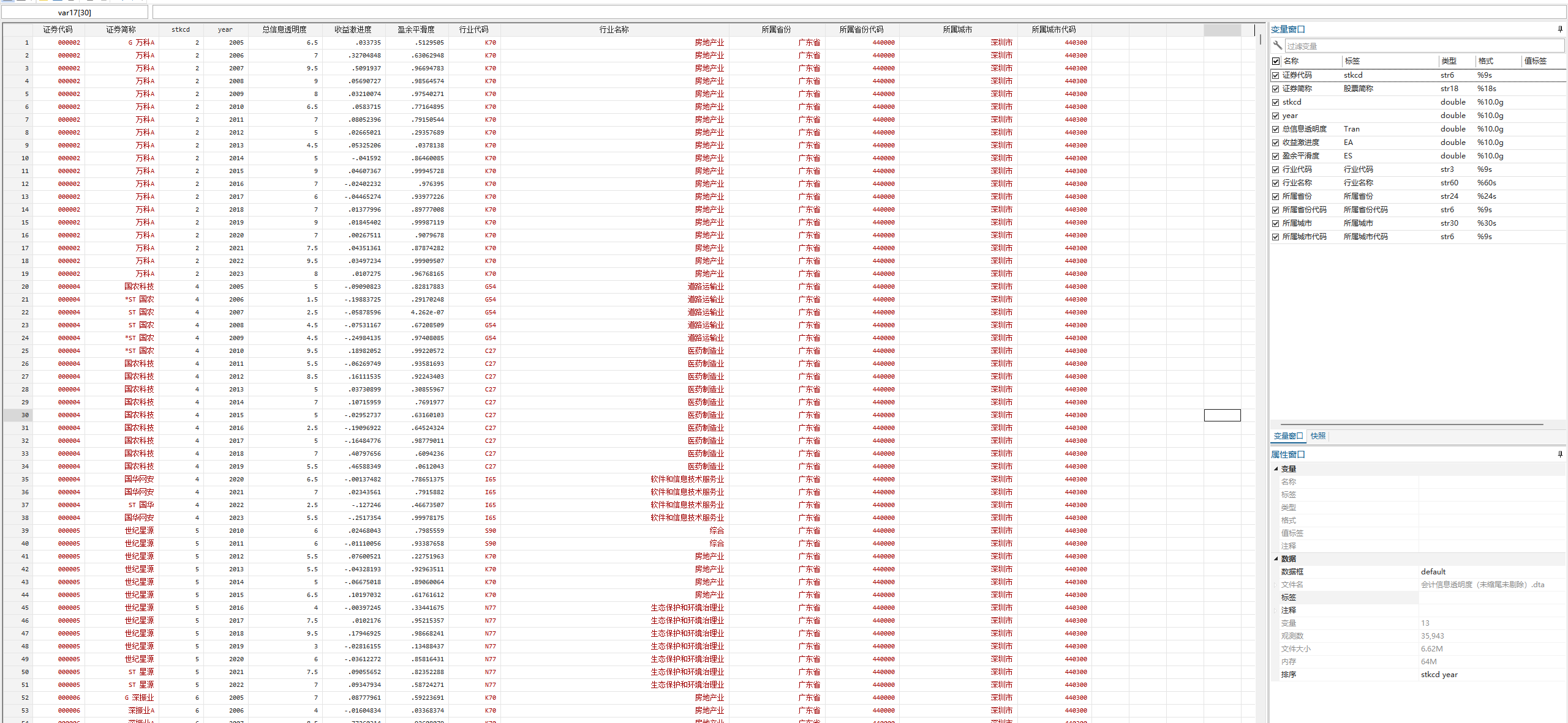 - 行业参照证监会2012年行业分类标准,制造业用二级行业分类,其他用一级分类来计算并对连续型变量进行了1%和99%分位数的缩尾处理