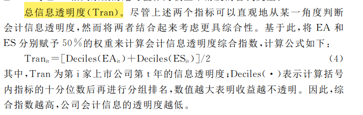 表示计算括号内指标的十分位数后再进行分组排名,数值越大表明收益越不透明。因此,综合指数越高,公司会计信息的透明度越低。