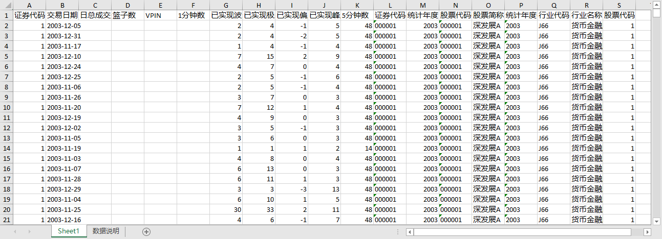证券代码 交易日期 日总成交量 篮子数 VPIN 1分钟数 已实现波动率 已实现极差波动率 已实现偏度 已实现峰度 5分钟数 证券代码c 统计年度 股票代码C 股票简称 统计年度C 行业代码 行业名称 股票代码