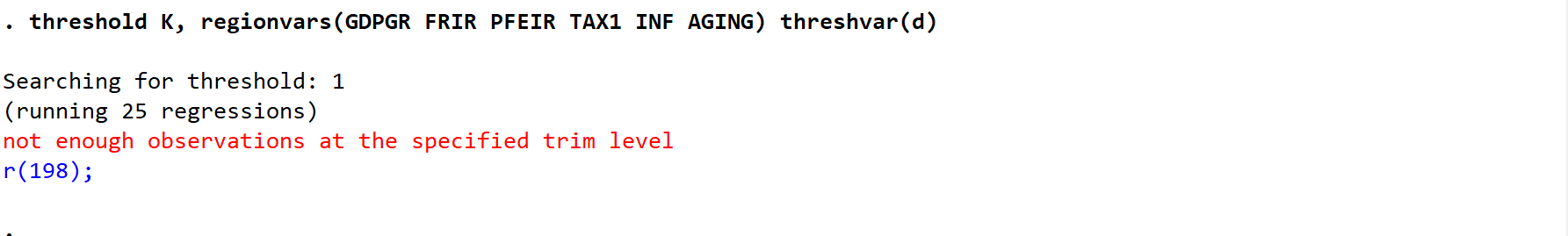 我用30年的年度数据做时间序列的门槛回归,stata输入threshold y ,regionvars(x1 x2 x3 x4 x5 x6) threshvar(d) 结果出来的报错是not enough observations at the specified trim level