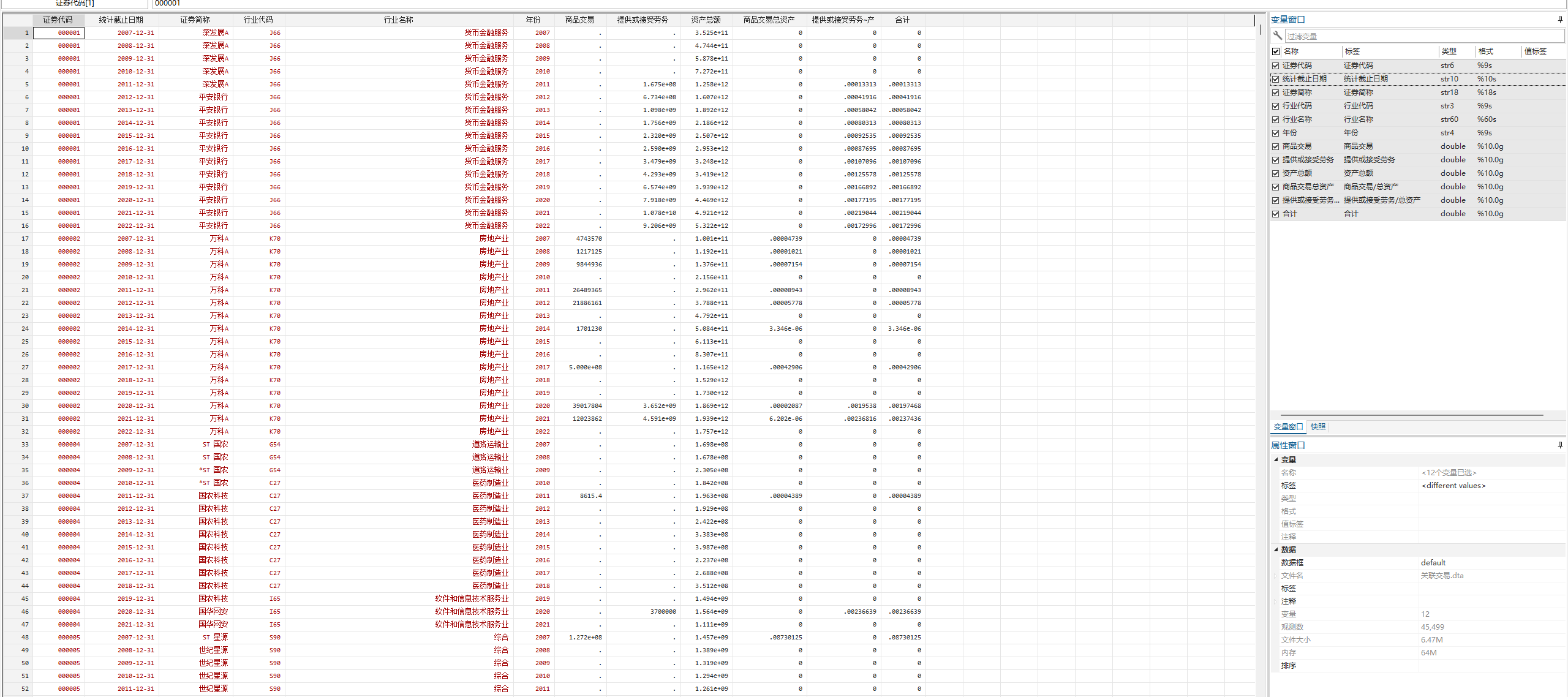 5056家企业,4.5万多个观测值,具体指标为 证券代码 统计截止日期 证券简称 行业代码 行业名称 年份 商品交易 提供或接受劳务 资产总额 商品交易总资产 提供或接受劳务总资产 合计