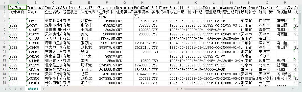 统计年度 公司ID 企业名称 经营状态 法定代表人 注册资本 注册资本币种 实缴资本 实缴资本币种 成立日期 核准日期 营业期限开始日期 营业期限结束日期 所属省份 所属城市 所属区县 统一社会信用代码 工商注册号 组织机构代码 参保人数 公司类型 曾用名 注册地址 公司电话 公司邮箱 经营范围