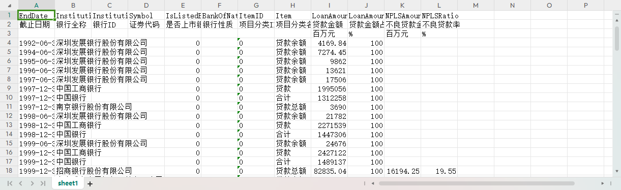 主要指标:截止日期 银行全称 银行ID 证券代码 是否上市银行 银行性质 项目分类ID 项目分类名称 贷款金额 贷款金额占比 不良贷款金额 不良贷款率