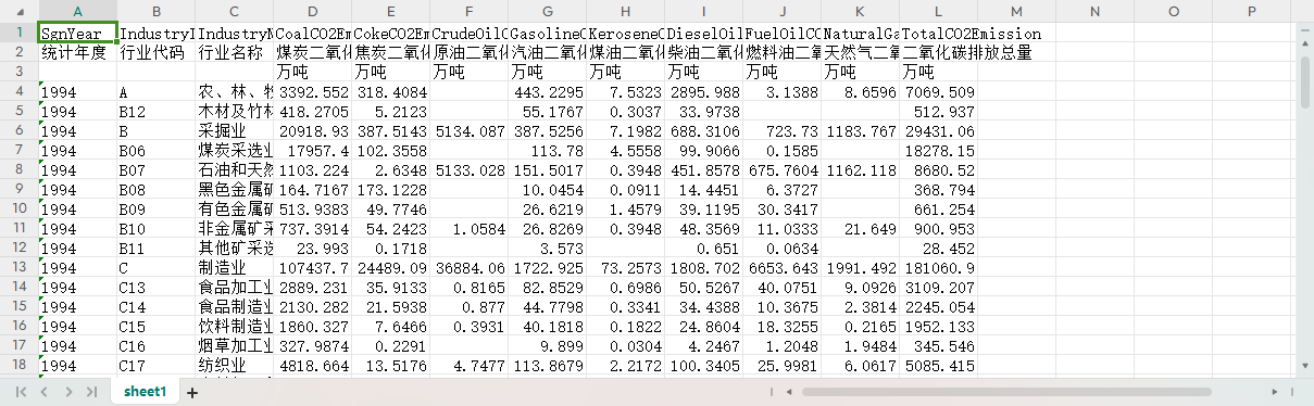 统计年度 行业代码 行业名称 煤炭二氧化碳排放量 焦炭二氧化碳排放量 原油二氧化碳排放量 汽油二氧化碳排放量 煤油二氧化碳排放量 柴油二氧化碳排放量 燃料油二氧化碳排放量 天然气二氧化碳排放量 二氧化碳排放总量
