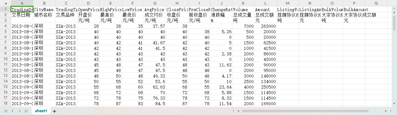 交易日期 城市名称 交易品种 开盘价 最高价 最低价 成交均价 收盘价 前收盘价 涨跌幅 总成交量 总成交额 挂牌协议成交量 挂牌协议成交额 大宗协议成交量 大宗协议成交额