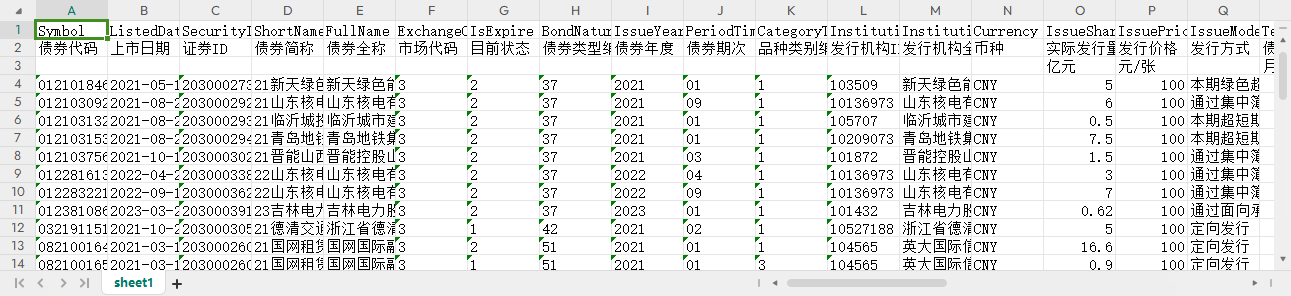 债券代码 上市日期 证券ID 债券简称 债券全称 市场代码 目前状态 债券类型编码 债券年度 债券期次 品种类别编码 发行机构ID 发行机构全称 币种 实际发行量 发行价格 发行方式 债券期限 发行起始日期 到期日期 计息日期 止息日期 摘牌日期 付息方式编码 计息方式编码 年付息次数 票面利率 债项评级 债券主体评级 可赎回性 赎回条款 赎回日期 赎回价格 可回售性 回售条款 回售日期 回售价格 可调换性 是否跨市场 跨市场说明 是否可分离 承销方式 发行对象 网上发行数量 计息基础 第一次付息日 行权类型 看涨看跌