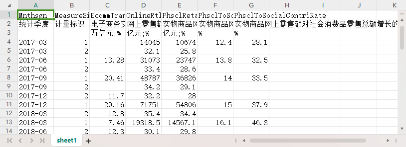统计季度 计量标识 电子商务交易额 网上零售额 实物商品网上零售额 实物商品网上零售额占社会消费品零售总额的比重 实物商品网上零售额对社会消费品零售总额增长的贡献率