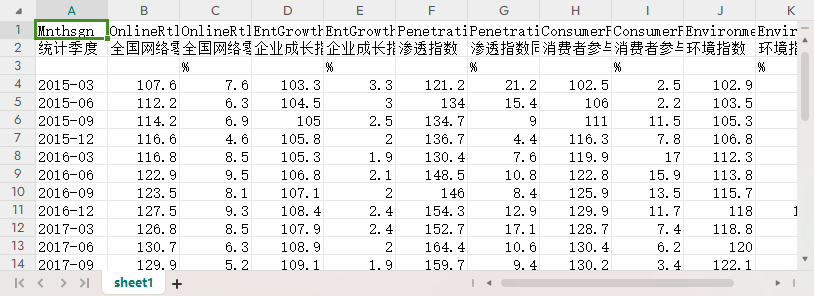 统计季度 全国网络零售发展指数 全国网络零售发展指数同比 企业成长指数 企业成长指数同比 渗透指数 渗透指数同比 消费者参与指数 消费者参与指数同比 环境指数 环境指数同比