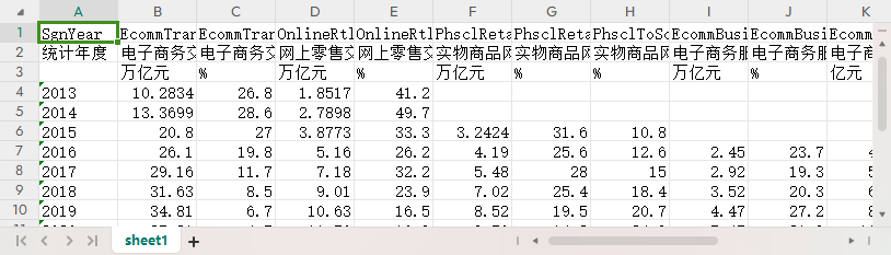 统计年度 电子商务交易额 电子商务交易额同比增长 网上零售交易额 网上零售交易额同比增长 实物商品网上零售额 实物商品网上零售额同比增长 实物商品网上零售额占社会消费品零售总额的比重 电子商务服务业营业收入 电子商务服务业营业收入同比增长 电子商务交易平台服务营业收入 农村网络零售额 农村网络零售额同比增长 跨境电子商务零售进出口总额 跨境电子商务零售进出口总额同比增长 电子商务从业人员 电子商务从业人员同比增长