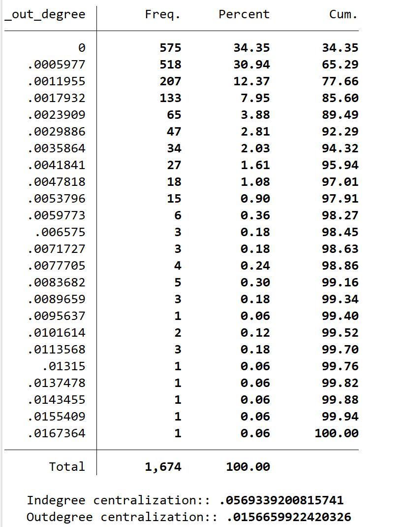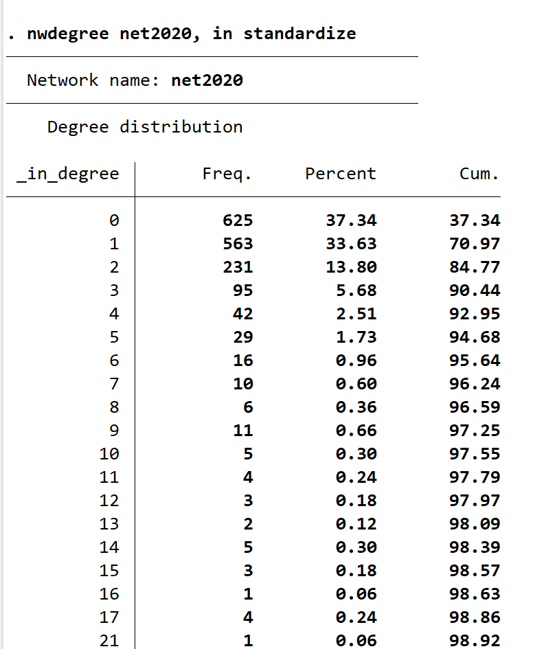 各位前辈,我在用stata计算网络中心度指标用来当作解释变量回归,但用nwdegree变量加了standardize option ,outdegree 输出标准化了,但indegree 没有标准化,具体命令如下:
