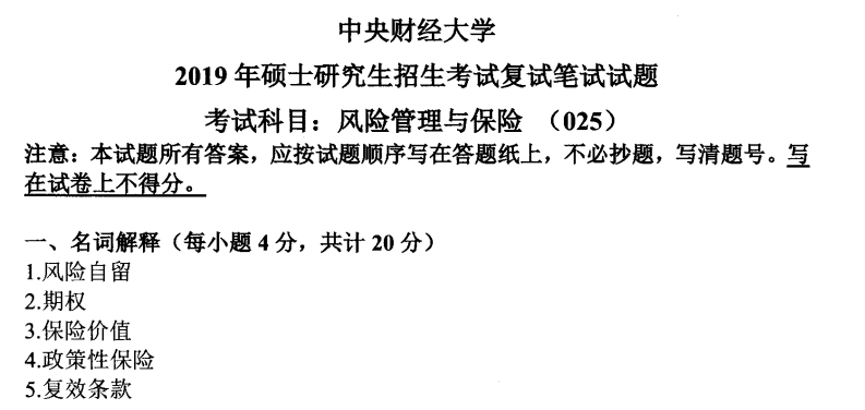 中财中央财经大学考研复试真题风险管理与保险2016-2019(无答案)