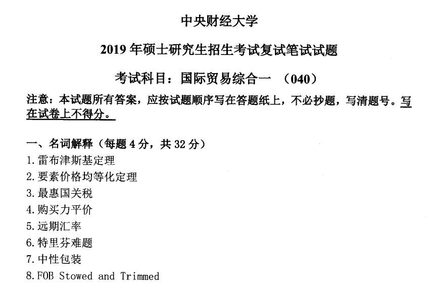 中财中央财经大学国际贸易综合一考研复试真题2010-2019(无答案).pdf