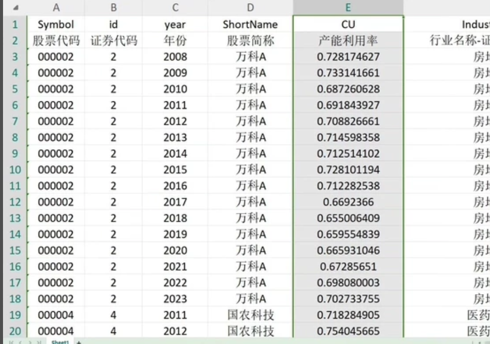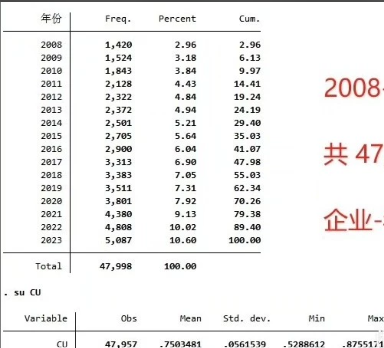 企业产能利用率【范围】2008 - 2023 年,共 47,998 条观测值,全部A股上市公司【注意】剔除了 ST或*ST 或 PT、金融业 或 员工人数为0 的观测值。【方法】复刻了《财经研究》《数经》等顶级期刊,使用随机前沿生产函数法来测算企业产能利用率CU,定义为实际产出除以前沿产出,使用营业收入、资产总额和企业人数来构建随机前沿生产面,进而计算企业产能利用率。主要指标如下:CU:企业产能利用率,值越大,产能利用率越高。CU的最小值为52.88%,最大值为87.55%,标准差为5.6%,说明不同企业间的产能利用率有所差异。发原始数据、运行代码、最终结果(Excel和Dta)、参考文献