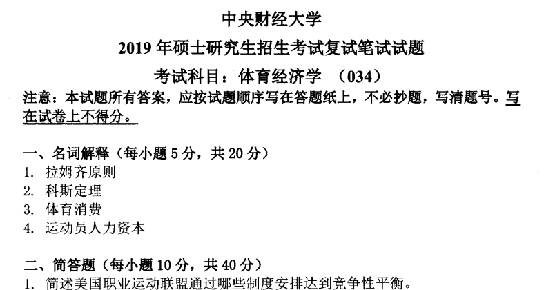 中财中央财经大学体育经济学考研复试真题2016-2019(无答案)