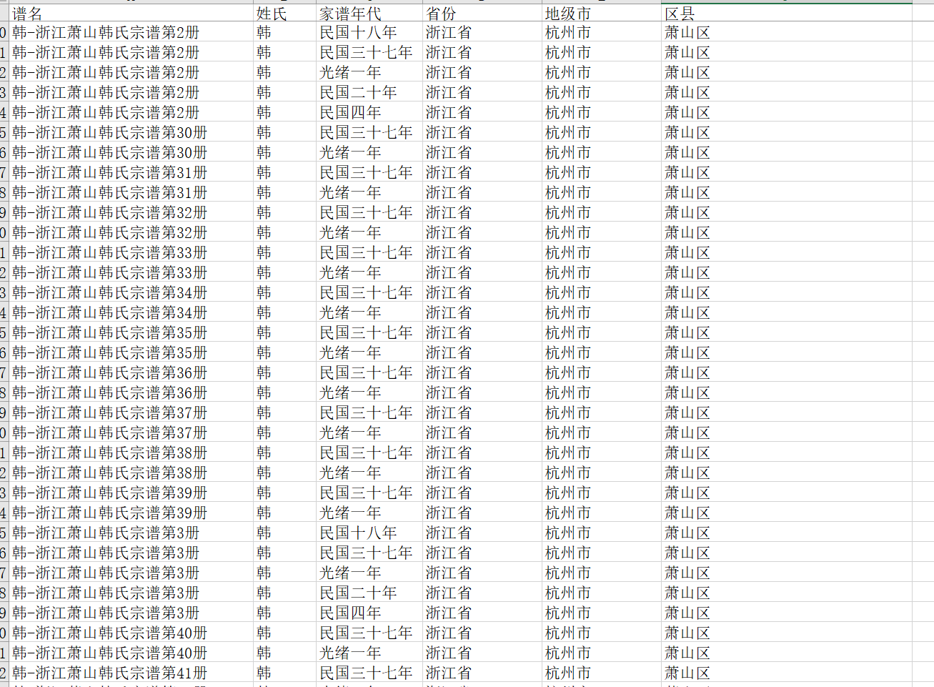 数据使用Python爬取华中师范大学自2019年以来维护的中国家谱数据库,其中收集了县级家谱书信息。截至2018年6月,该数据库已收集了 17723份家谱(共132499卷),是世界上最大的中国家谱数据库。