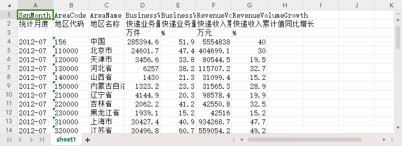 统计月度 地区代码 地区名称 快递业务量累计值 快递业务量累计值同比增长 快递收入累计值 快递收入累计值同比增长