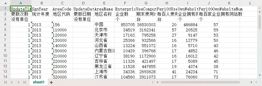 更新次数 统计年度 地区代码 更新日期 地区名称 企业数 期末使用计算机数 每百人使用计算机数 企业拥有网站数 每百家企业拥有网站数