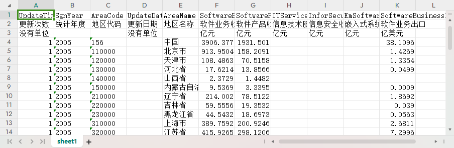 更新次数 统计年度 地区代码 更新日期 地区名称 软件业务收入 软件产品收入 信息技术服务收入 信息安全收入 嵌入式系统软件收入 软件业务出口