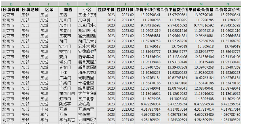 02、相关数据及指标序号,行政区划代码,所属省份,所属地域,区域,商圈,小区,挂牌年份,挂牌月份,单价平均价格,单价中位数价格,单价最低价格,单价最高价格,总价平均价格,总价中位数价格,总价最低价格,总价最高价格。