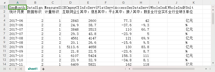 统计月度 数据标识 计量标识 互联网企业完成业务收入 其中:信息服务收入 其中:平台服务收入 其中:接入服务收入 其中:数据服务收入 全行业实现营业利润 全行业研发投入 单位