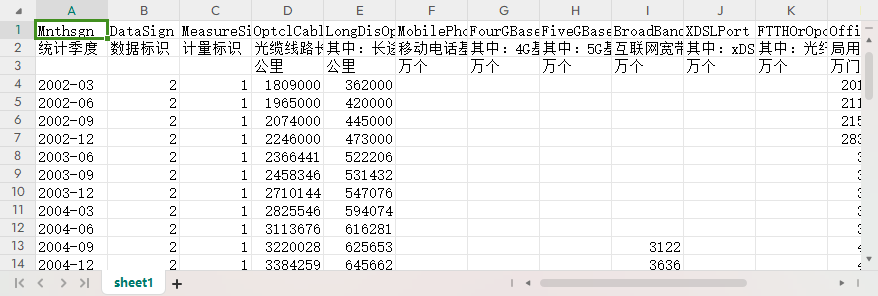 统计季度 数据标识 计量标识 光缆线路长度 其中:长途光缆线路长度 移动电话基站数 其中:4G基站数 其中:5G基站数 互联网宽带接入端口 其中:xDSL端口 其中:光纤接入(FTTH/O)端口 局用交换机容量 其中:接入网设备容量 移动电话交换机容量 长途电话交换机容量