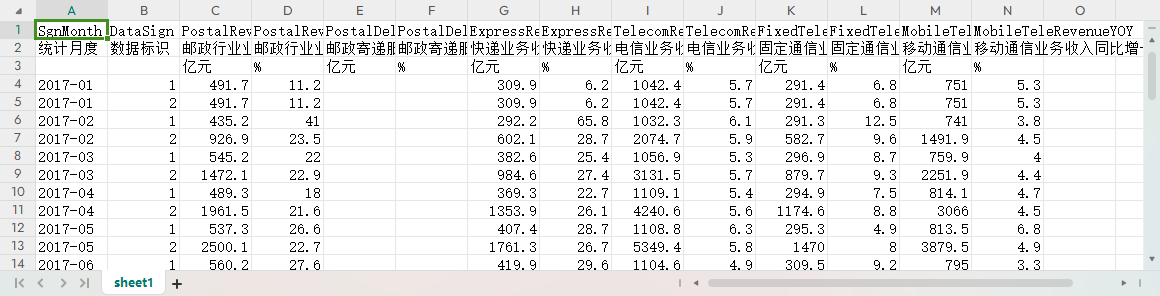 统计月度 数据标识 邮政行业业务收入 邮政行业业务收入同比增长 邮政寄递服务收入 邮政寄递服务收入同比增长 快递业务收入 快递业务收入同比增长 电信业务收入 电信业务收入同比增长 固定通信业务收入 固定通信业务收入同比增长 移动通信业务收入 移动通信业务收入同比增长