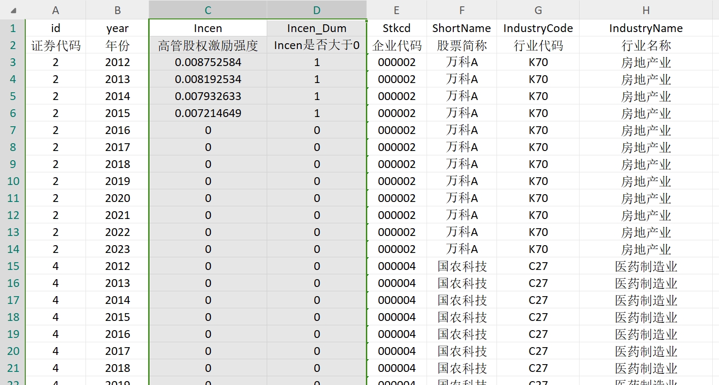 高管股权激励强度,等于高管获授的期权和限制性股票的数量与公司股票总数之比