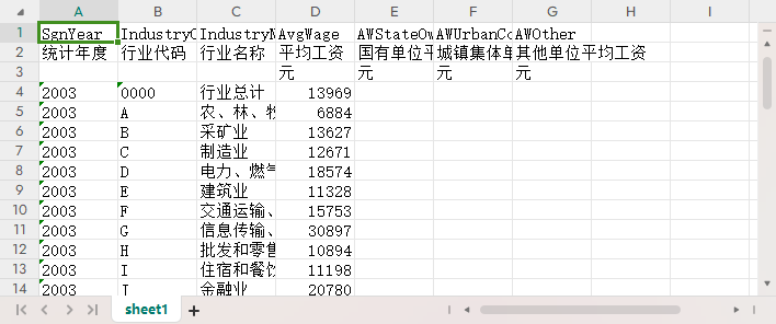 统计年度 行业代码 行业名称 平均工资 国有单位平均工资 城镇集体单位平均工资 其他单位平均工资