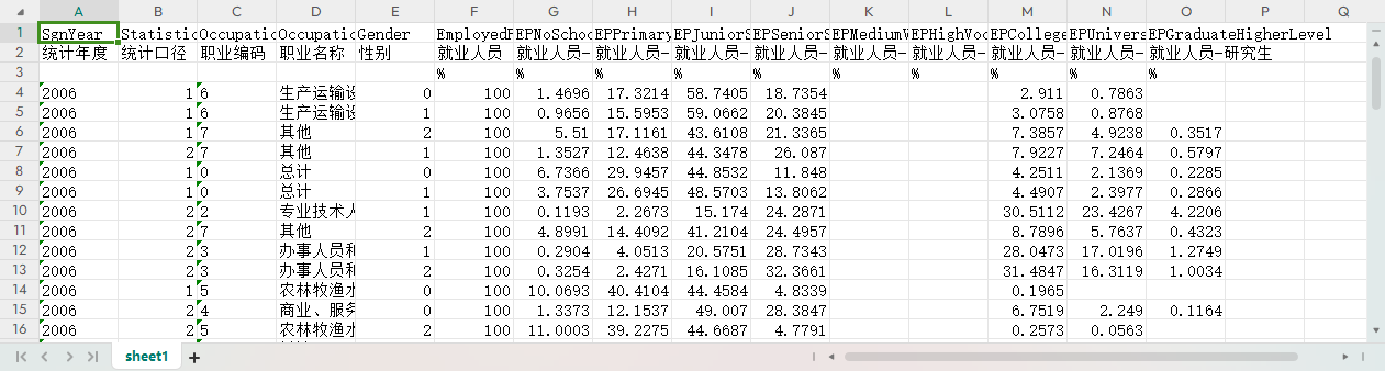 统计年度 统计口径 职业编码 职业名称 性别 就业人员 就业人员-未上过学 就业人员-小学 就业人员-初中 就业人员-高中 就业人员-中等职业教育 就业人员-高等职业教育 就业人员-大学专科 就业人员-大学本科 就业人员-研究生