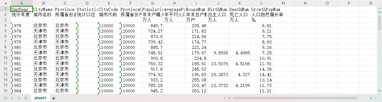 统计年度        城市名称        所属省份名称        统计口径        城市代码        所属省份代码        年末户籍人口        年平均人口        年末总户数        出生人口        死亡人口        人口自然增长率