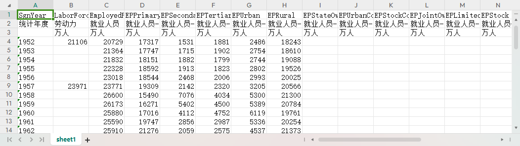 统计年度 劳动力 就业人员 就业人员-第一产业 就业人员-第二产业 就业人员-第三产业 就业人员-城镇 就业人员-乡村 就业人员-国有单位 就业人员-城镇集体单位 就业人员-股份合作单位 就业人员-联营单位 就业人员-有限责任单位 就业人员-股份有限公司 就业人员-港澳台商投资单位 就业人员-外商投资单位 就业人员-城镇私营企业 就业人员-城镇个体 就业人员-乡村私营企业 就业人员-乡村个体 城镇登记失业人数 城镇登记失业率 城镇调查失业率