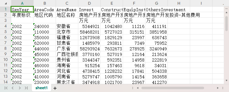 年度标识 地区代码 地区名称 房地产开发投资 房地产开发投资-建筑安装工程 房地产开发投资-设备工器具购置 房地产开发投资-其他费用
