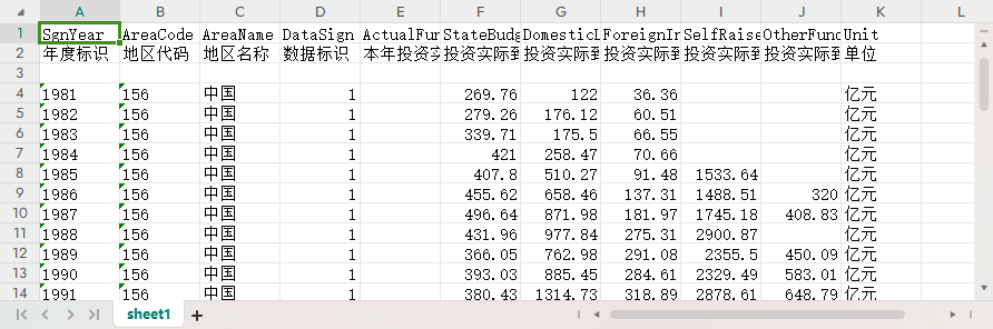 年度标识 地区代码 地区名称 数据标识 本年投资实际到位资金小计 投资实际到位资金-国家预算资金 投资实际到位资金-国内贷款 投资实际到位资金-利用外资 投资实际到位资金-自筹资金 投资实际到位资金-其他资金 单位