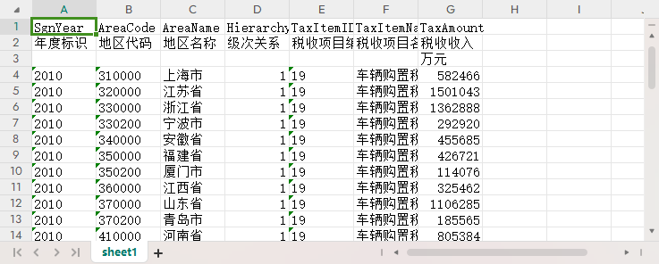 年度标识 地区代码 地区名称 级次关系 税收项目编码 税收项目名称 税收收入