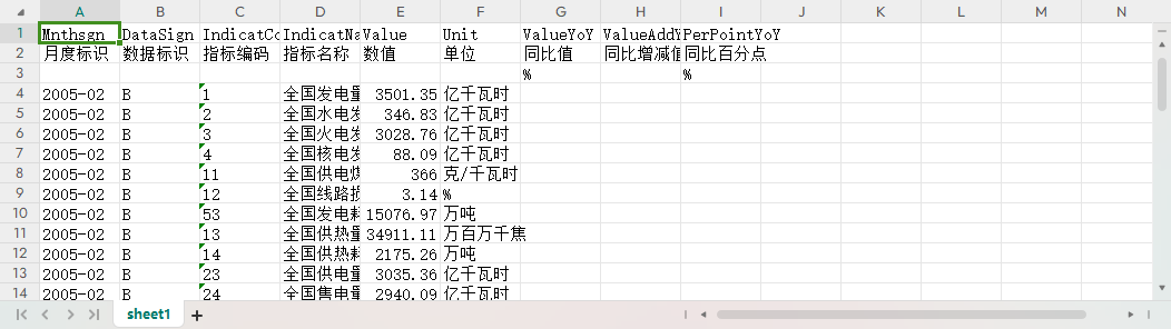 月度标识 数据标识 指标编码 指标名称 数值 单位 同比值 同比增减值 同比百分点