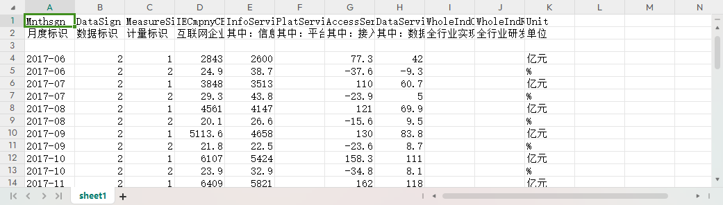月度标识 数据标识 计量标识 互联网企业完成业务收入 其中:信息服务收入 其中:平台服务收入 其中:接入服务收入 其中:数据服务收入 全行业实现营业利润 全行业研发投入 单位